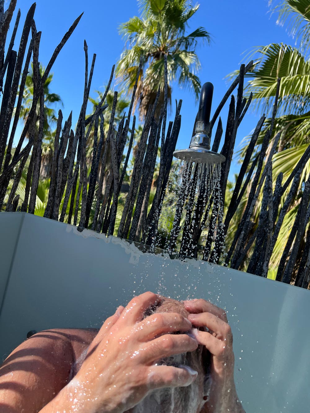 We love outdoor showers – and showering outdoors here, surrounded by palms with sunlight filtering through the leaves, is pure Acre magic.